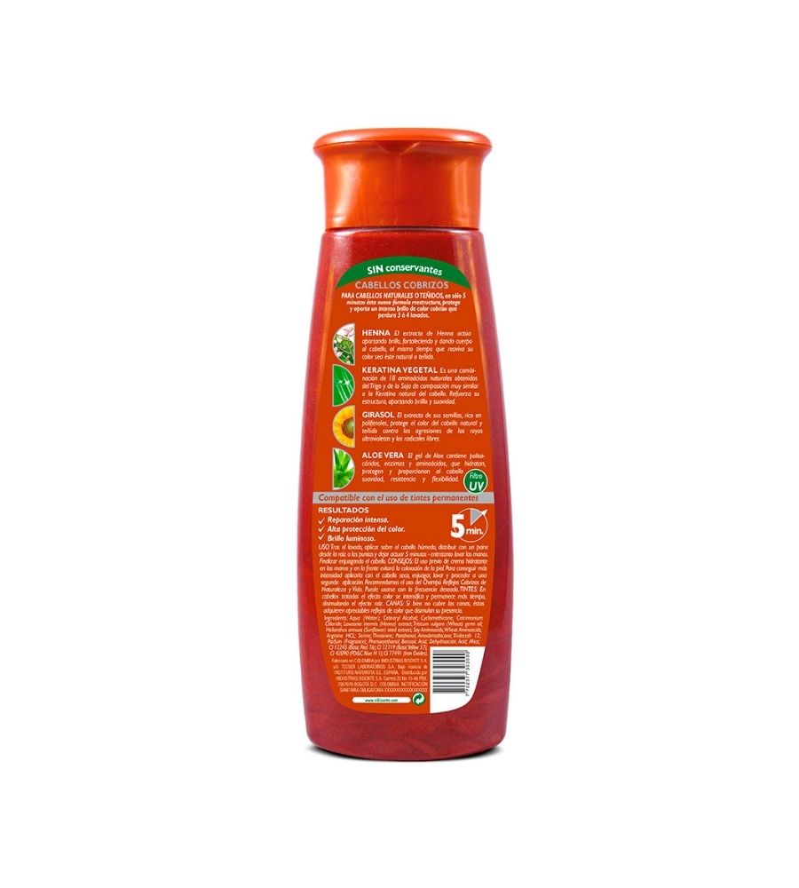Nueva fórmula triple acción, con extractos 100% natural de Germen de Trigo, Henna y Semillas de Girasol para cabellos naturales o tinturados, aporta color sin amoniacos realzando el color natural del cabello y a la vez que lo protege de las agresiones del sol, dejándolo más suave, sano y brillante. El color que tú quieres, de manera natural y en solo 5 minutos. Es compatible con el uso de tintes permanentes y el efecto color se elimina progresivamente en 3 ó 4 lavados.